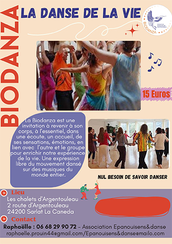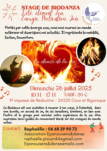 Je suis Raphaëlle, passionnée par la danse depuis mon enfance, j’anime aujourd’hui des ateliers de Biodanza, "la Danse de la Vie" : un appel à la joie, à s'épanouir dans le plaisir du mouvement dansé, sur des musiques du monde entier et dans la rencontre fraternelle.
